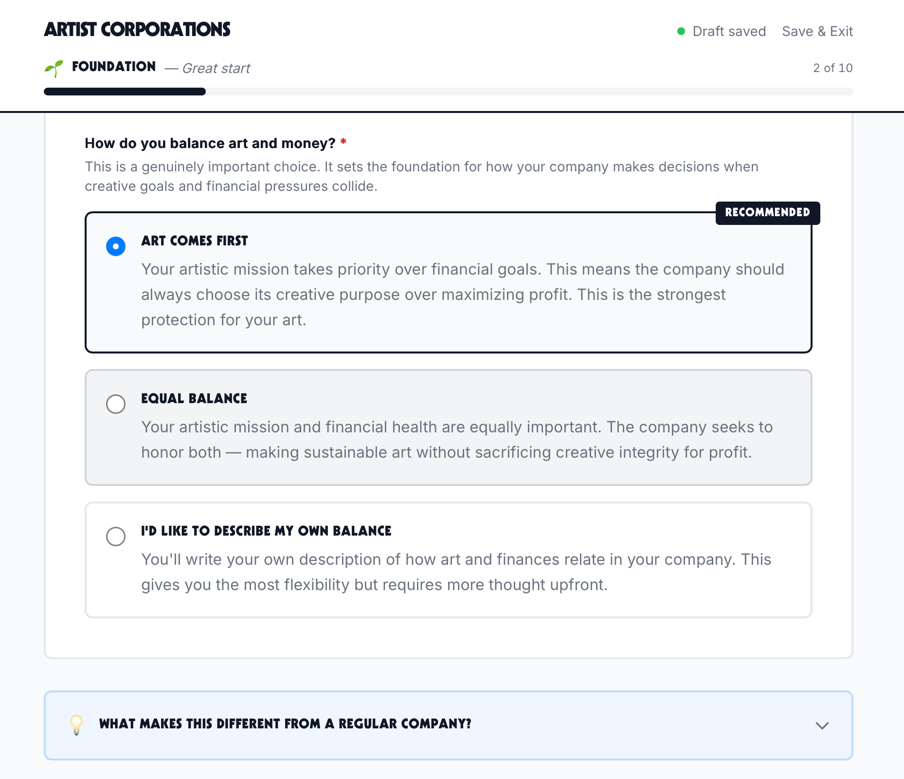 The other major project of the past year that will be coming more into focus is Artist Corporations. Now the A-Corp work has been fairly public so far, but it's the private part of the work that's been most consequential.