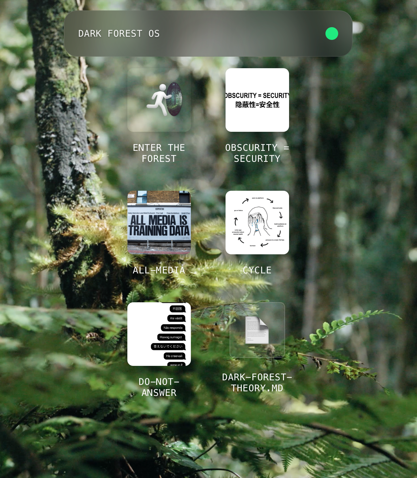 The dark forests have grown so vast that the metaphor now needs infrastructure. At Metalabel we’re building the Dark Forest Operating System, or DFOS: software that makes it possible for small groups to create their own private internets. The idea that once described how we hide will soon be architecture for how we can safely gather and not be alone.