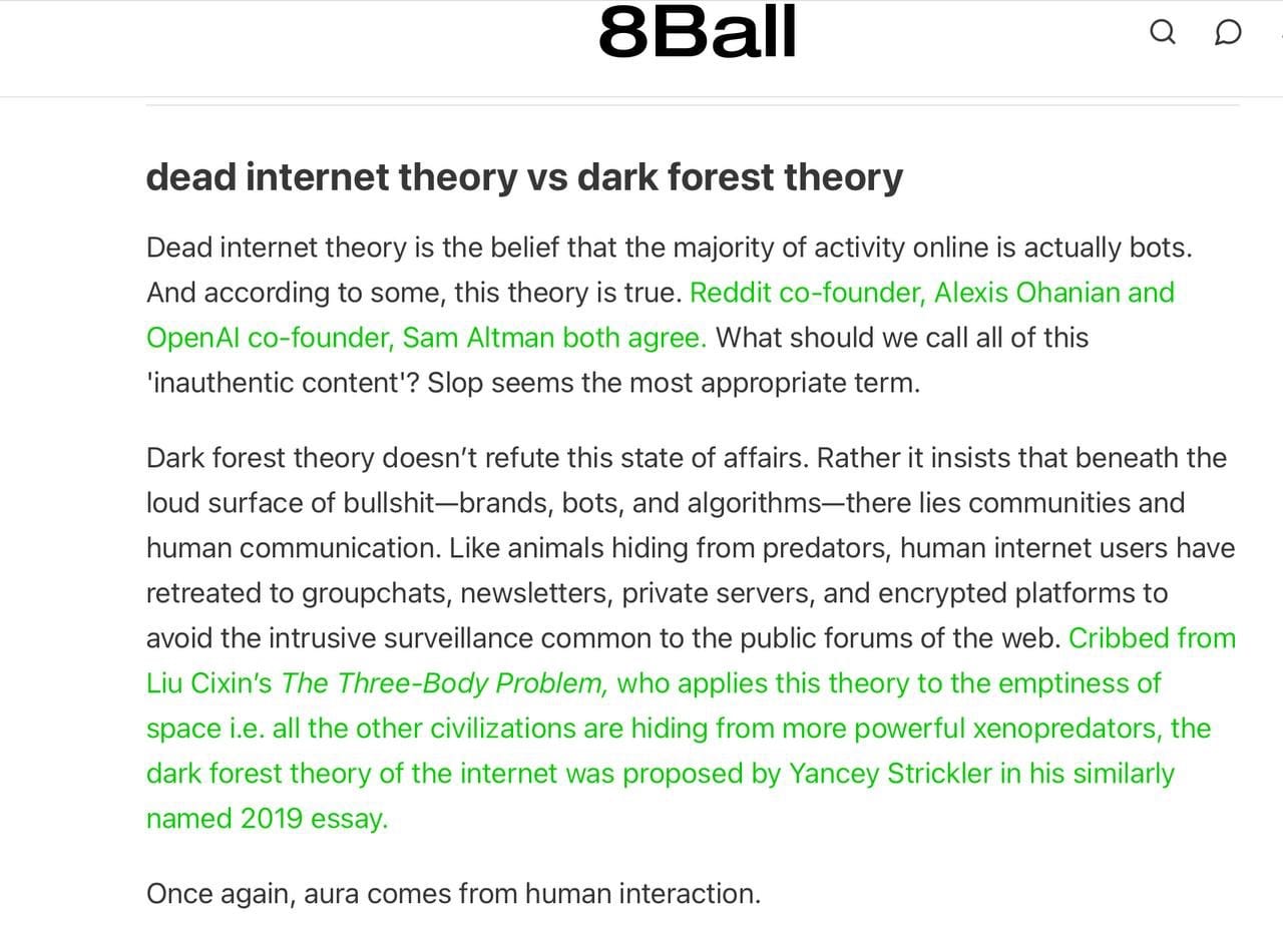 What was a theory of growth in the hidden corners of the internet has moved to the heart of it all in the years since. Even as humans use social media less, online spaces are increasingly being used for ideological gains, now aided by AI. There’s now more bot content than human content being posted for the first time. As Sean Monahan (formerly of K-Hole) writes, the iconic Dead Internet Theory that the internet will be increasingly non-human — which multiple tech leaders have recently echoed — combines with the Dark Forest Theory to explain the strange internet we inhabit today: