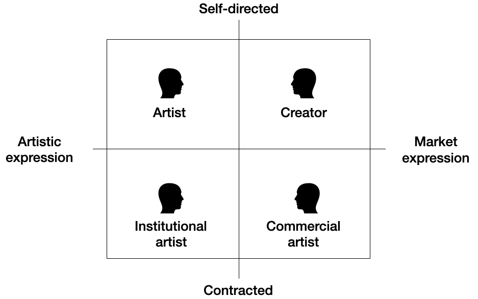 By increasing creative agency, we mean growing freedom for creative people to move between the quadrants of activity. Artist, Creator, Institutional Artist, and Commercial Artist are all potentially attractive and consequential roles for a creative person to embody, depending on the context. We should continue to work towards a creative universe where these roles are fluid and open to all.
