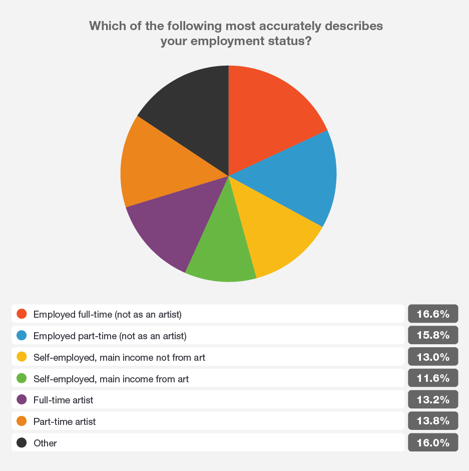 We can also dig deeper into just artists who already generate income from their work. In 2022, the Saatchi gallery conducted a survey of 500 artists who make money from their art. It found that 13% were able to earn a full-time living from their work, while 16% were employed full-time in non-art jobs. Here’s the full visualization of how people responded: